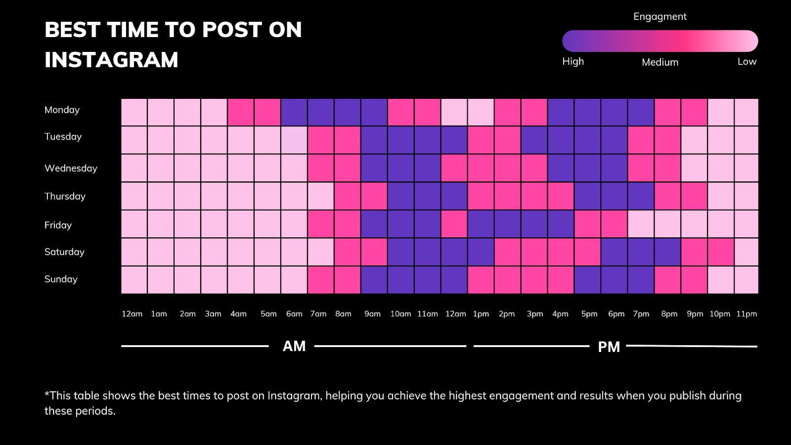 Reels often perform best during morning and evening peaks, while photos and carousels do well around lunch and early afternoon.